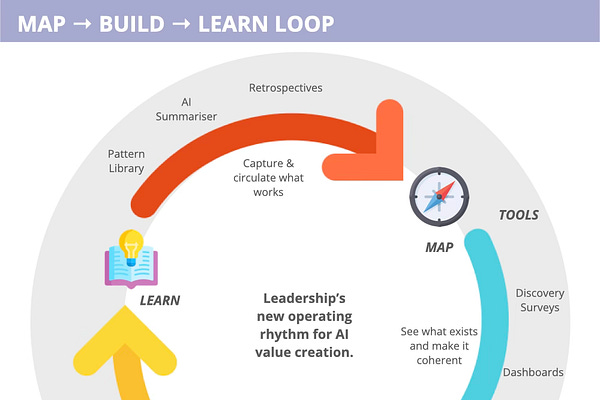 How leaders can use a simple Map → Build → Learn loop to turn scattered AI pilots into a coherent organisational world of value.