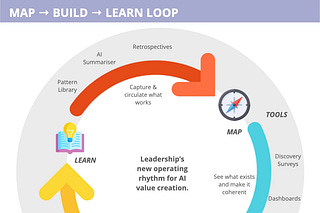 How leaders can use a simple Map → Build → Learn loop to turn scattered AI pilots into a coherent organisational world of value.