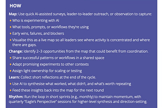 How leaders working together with a simple Map → Change → Learn loop can turn scattered AI experiments into living, organisation-wide capabilities.