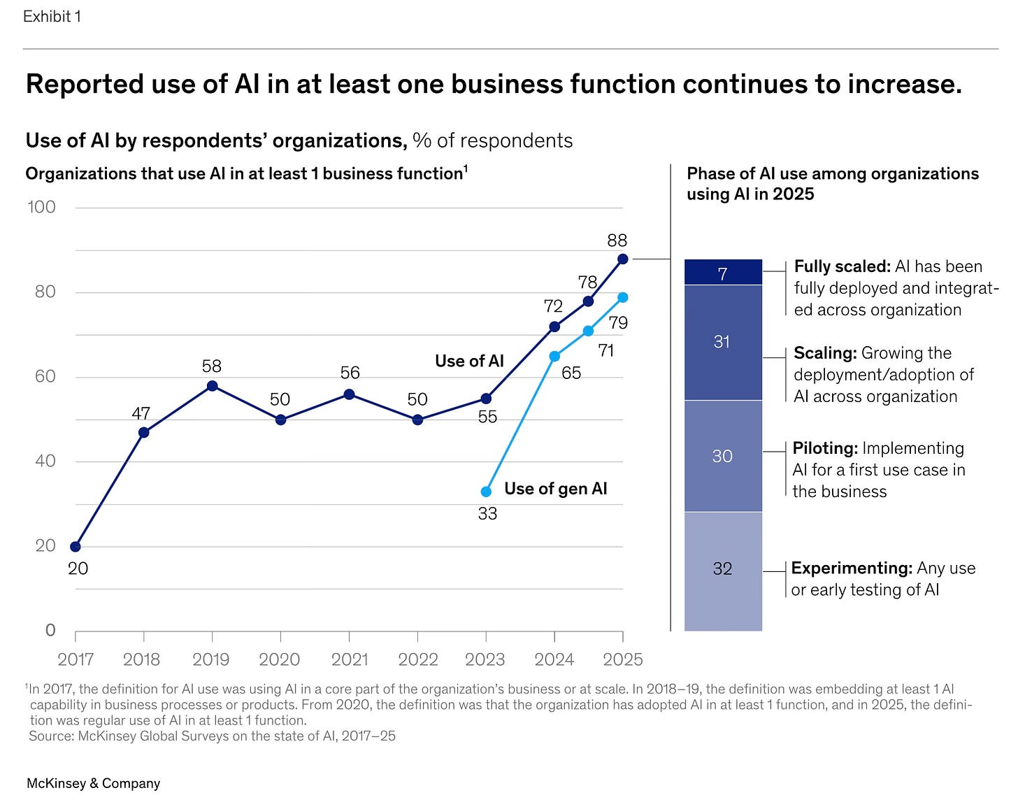 Last week, McKinsey released a new report The state of AI in 2025: Agents, innovation, and transformation, which found that while most firms are still in the pilot phase with Agentic AI and not yet scaling up, there is growing interest in the topic. In terms of the adoption impact of AI in general, the report found: