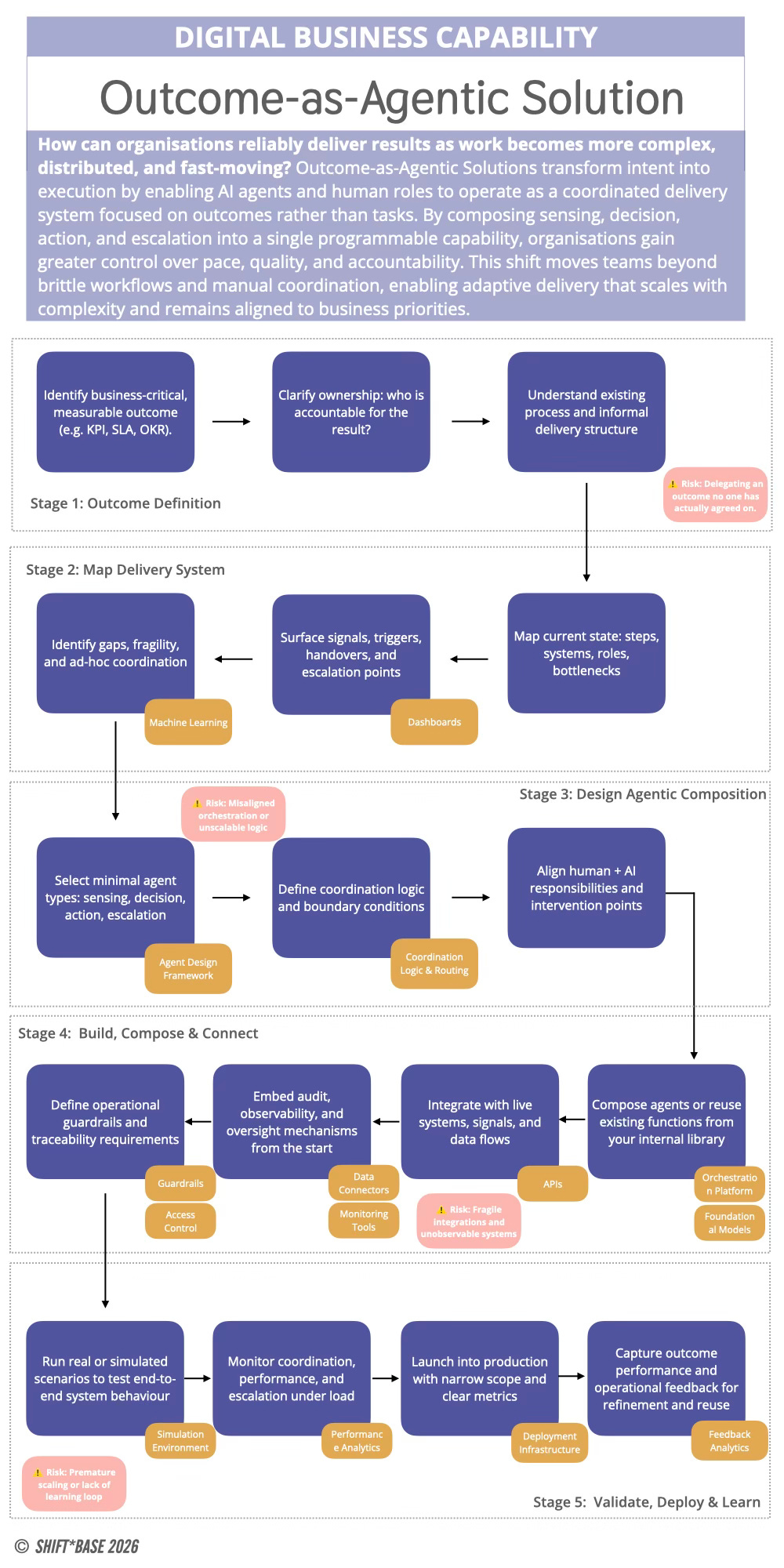 To treat Outcome-as-Agentic Solutions as a repeatable capability, rather than a series of disconnected experiments, organisations need to understand the building blocks that support it. This is not just about tools or platforms, but creating the conditions for composed, accountable delivery to emerge and evolve over time.